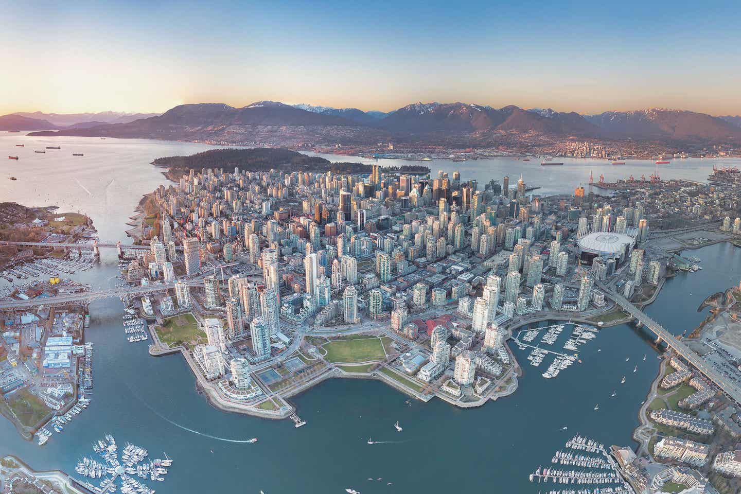 Vancouver in der Provinz British Columbia gilt als eine der lebenswertesten Städte der Welt und zugleich als eine der Top-Sehenswürdigkeiten im Westen Kanadas. Mit ihrer Lage an der Westküste vereint die Metropole Großstadtleben mit Stränden und Meer zum Baden im Sommer sowie Berge zum Wandern und Skifahren im Winter.
